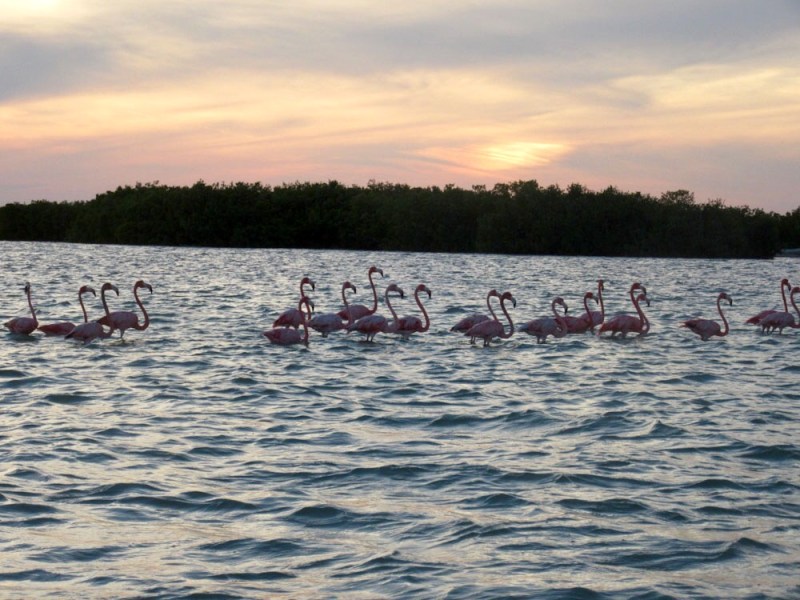 Les eaux peu profondes en face du village de Rio Lagartos permettent aux flamants roses de se nourrir. Yucatán, Mexique.