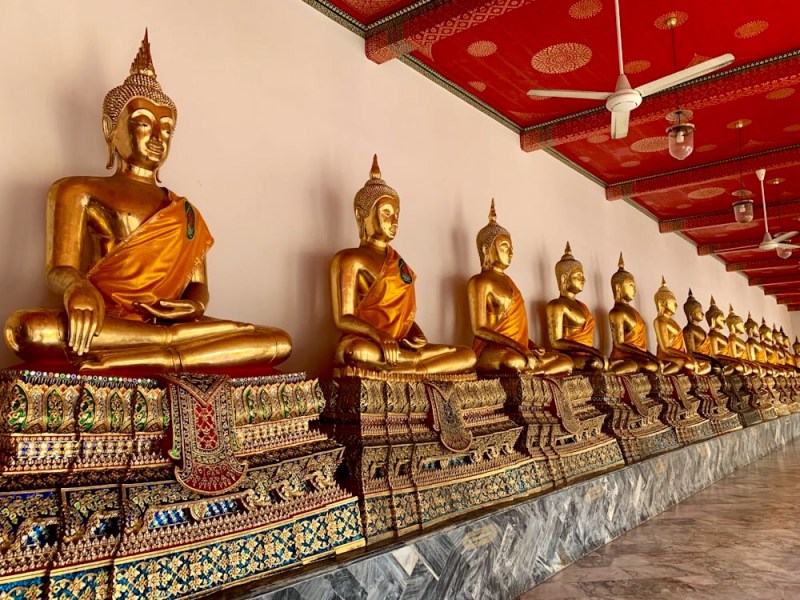 Plusieurs centaines de Bouddhas sont rangés dans les galeries entourant le Phra Ubosot, Wat Pho, Bangkok, Thaïlande.