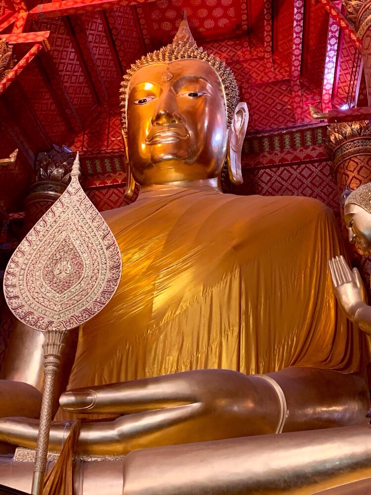 Un très grand bouddha doré nous accueille à l’entrée du temple. Il est magnifique et très imposant. Entouré de plus petits bouddhas, il a des fleurs à ses pieds, les murs et les plafonds sont entièrement recouverts de dorures. Wat Phanan Choeng Worawihan, Ayutthaya, Thaïlande.