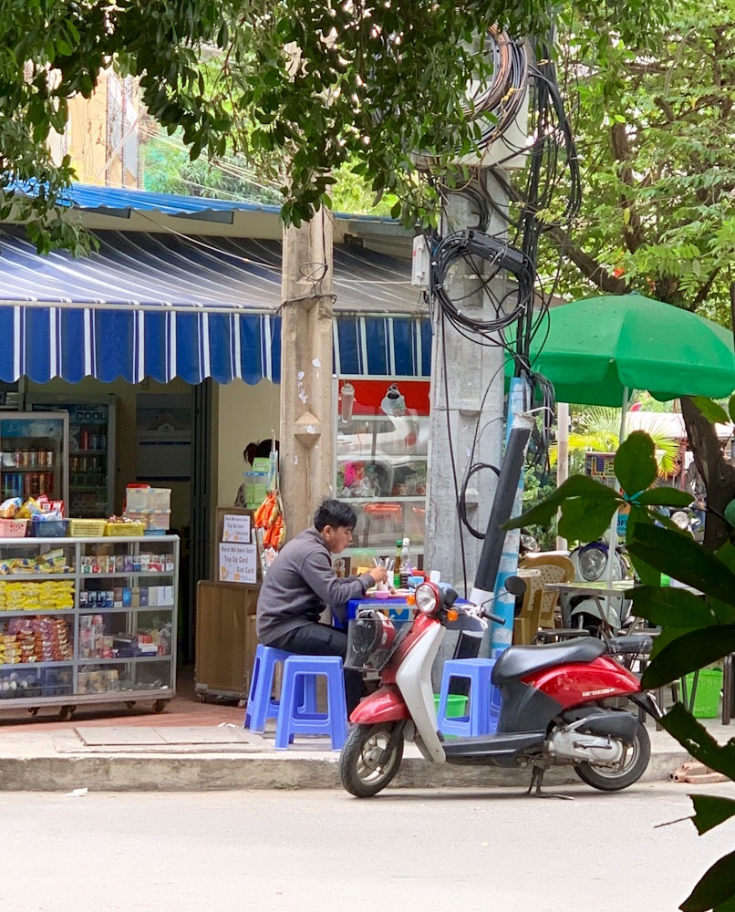 Un petit dépanneur au coin de la rue, en face de l’hôtel Anise, où nous achetons notre eau. Le matin, un moine vient y faire la prière et recueillir les offrandes. Des petits repas y sont servi, cuisinés tout près sur le trottoir. Il y a toujours de l’action, peu importe l’heure de la journée. Phnom Penh, Cambodge.
