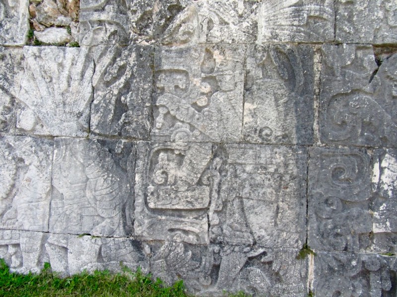 Des scènes du jeu de pelote sont toujours visibles sur les murs. Chichen Itzà, Yucatán, Mexique.