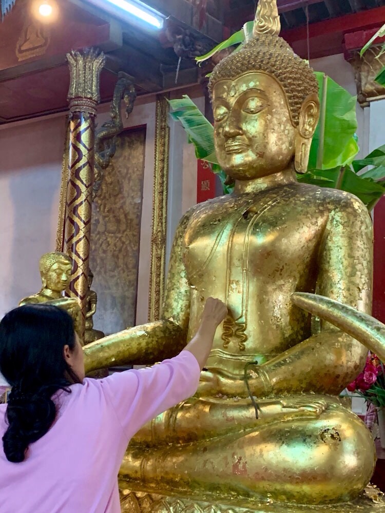 Une femme pose une feuille d’or sur un bouddha. Wat Phanan Choeng Worawihan, Ayutthaya, Thaïlande.