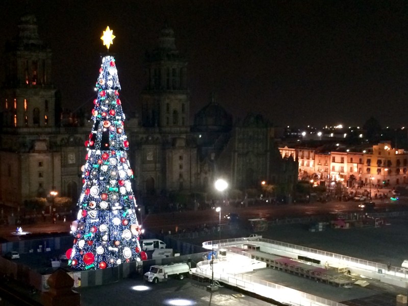 Vue sur le zocalo du Centro Historico, du Gran sapin de Noël et de la patinoire en plein air, à partir de la terrasse du Gran Hotel de Mexico. Mexique.