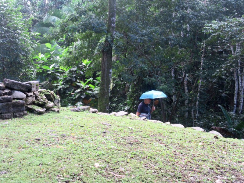 Lubaantun. La pluie s’est arrêtée aussi soudainement qu’elle est arrivée. Mais nous sommes dans la jungle et les gouttes continuent de tomber des arbres. Nous avons poursuivi la visite avec notre parapluie. Toledo District, Belize.