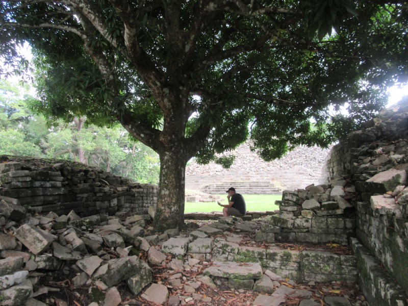 Mon amoureux se prépare à me faire la lecture des informations sur Lubaantun. Selon les archéologues, la cité était un centre administratif entre les années 730 et 860 de notre ère. Toledo District, Belize.