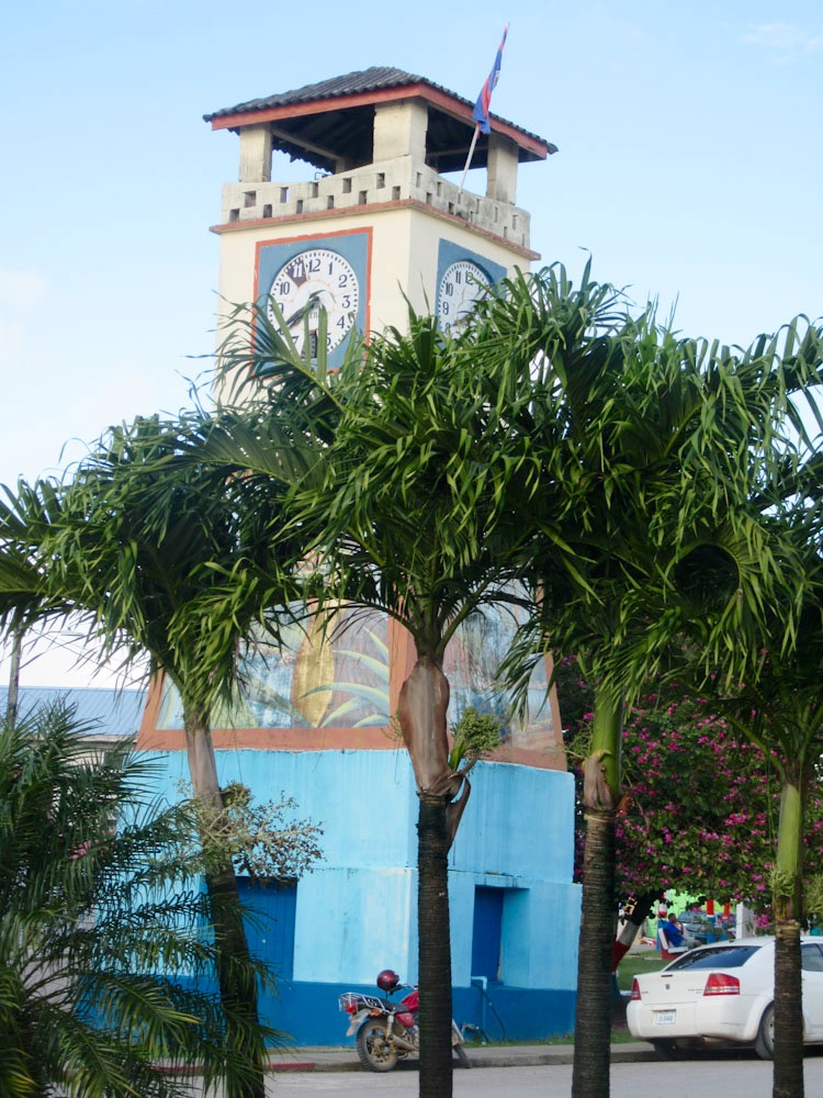 Horloge du Parque Central de Punta Gorda. Il y a beaucoup d’activités autour de ce parc et des commerces qui l’environnent. Toledo District, Belize.