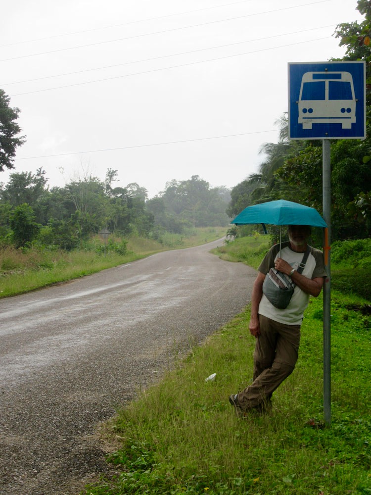 En attendant l’autobus après la visite de Nim Li Punit. La pluie tombe tous les jours et heureusement, nous traînons toujours notre parapluie. Toledo District, Belize.
