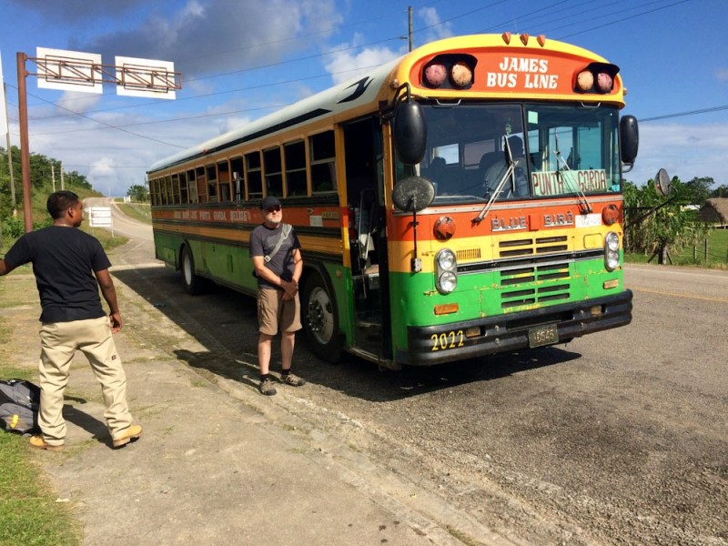 Les autobus du Belize sont des anciens autobus scolaires. Ici, le préposé vient de sortir les bagages d’un passager. Nous attendons sa permission avant d’entrer afin de laisser le passage à ceux qui sortent. Toledo District, Belize.