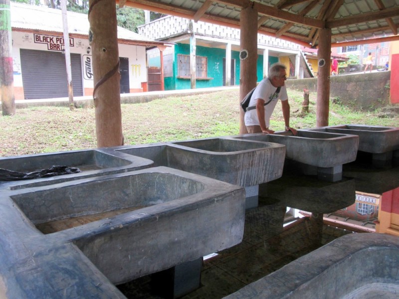 L’installation de ce lavoir est très efficace. Les vêtements sont lavés dans une des cuves de béton alors que l’eau claire du fond du lavoir est recueillie à l’aide d’un récipient. Livingston, Guatemala.