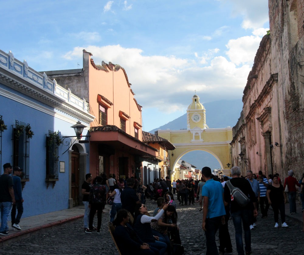 L’arc de Santa Catalina, une structure emblématique d’Antigua, tranche sur la silhouette d’un volcan éteint, Guatemala.