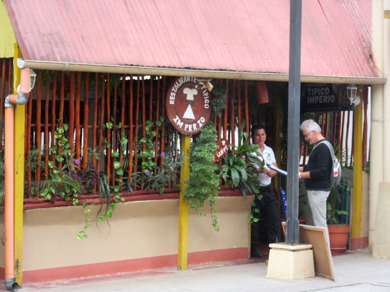 Mon amoureux semble avoir trouvé un menu qui lui plaît. Tant mieux, c’est l’heure de la pause. Flores, Petén, Guatemala.