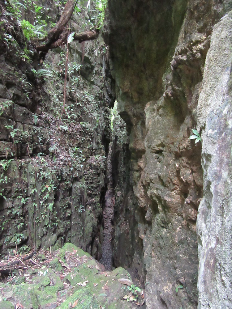 Une crevasse séparait la cité en deux et devait la protéger des attaques ennemies. Les deux parties étaient reliées par un pont de pierre. Aguateca, Petén, Guatemala.