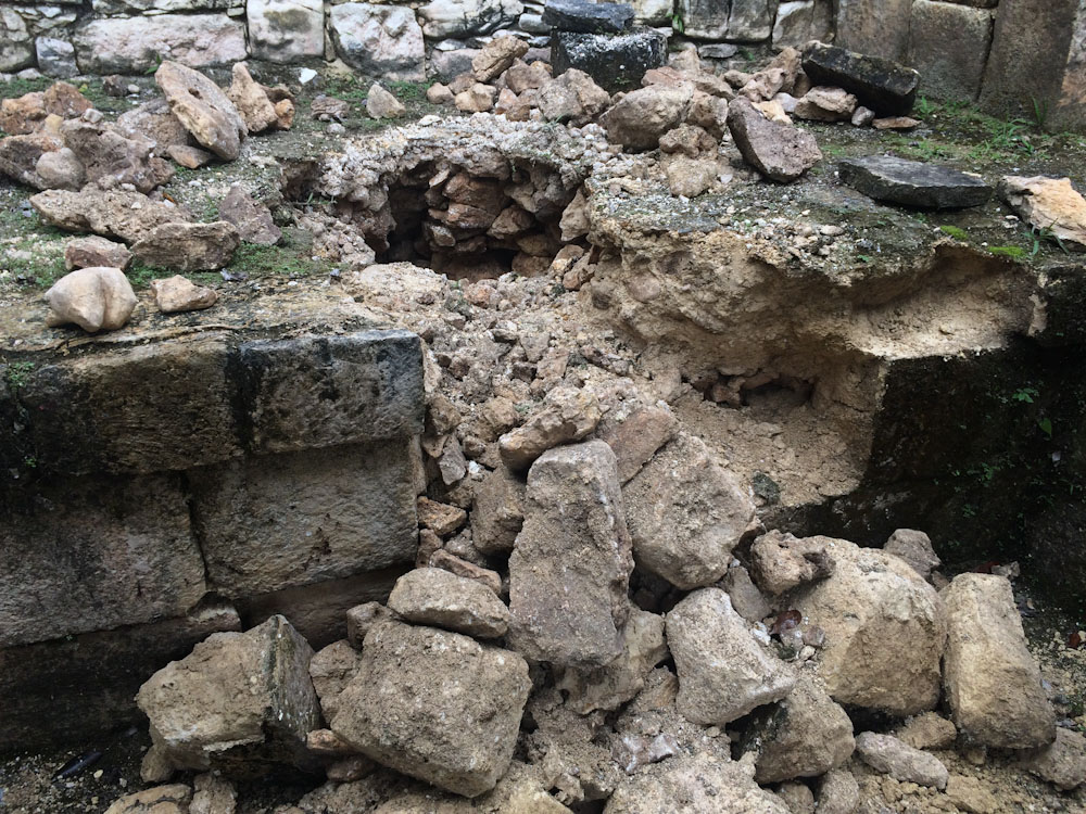 Le gardien du site nous explique qu’ils ne doivent pas essayer de réparer les dégâts des pilleurs, mais plutôt attendre la venue des archéologues afin qu’ils puissent numéroter les pierres avant d’amorcer les travaux et de tout replacer dans le bon ordre.