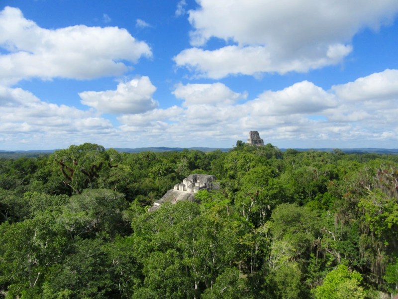 Les temples principaux de Tikal sont visibles au dessus de la jungle du Petén. Nous pouvons les imaginer peints de couleurs bleues, rouges ou jaunes. Impressionnant, non? Guatemala.
