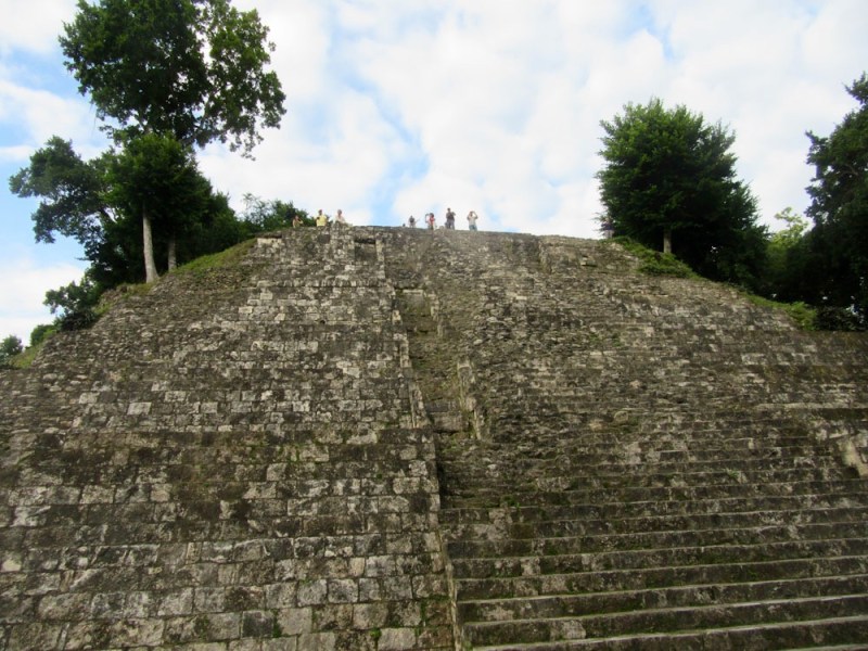 Je reste les pieds sur le sol, au milieu de l’Acropolis Norte à observer mon amoureux devenu si petit en haut de ce temple. Cela me permet d’apprécier la hauteur de la structure qui se dresse devant moi. Yaxhá, Petén, Guatemala.